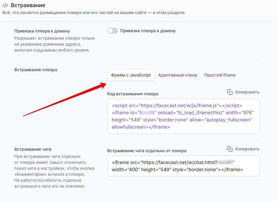 В данном блоке с настройками вы можете выбрать вариант встраивания, так можно выбрать «адаптивный» вариант, который пытается подстраиваться внутри выделенного ему контейнера. Так же можно выбрать «фрейм с Javascript» или «Простой iframe». Первый вариант подходит для встраивания на большинство сайтов и обладает дополнительными возможностями, например, в нем предусмотрена передача UTM-меток. Второй вариант предлагается для встраивания на сайты, которые не поддерживают JavaScript.После выбора варианта встраивания вы можете скопировать код для вставки на сайт. Он вставляется в виде обычного html кода.